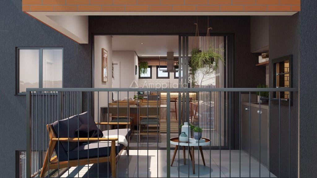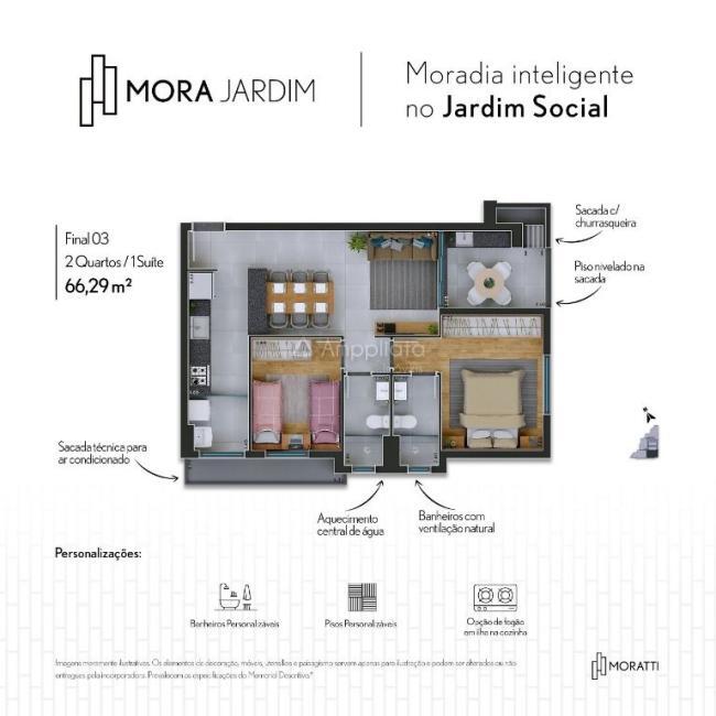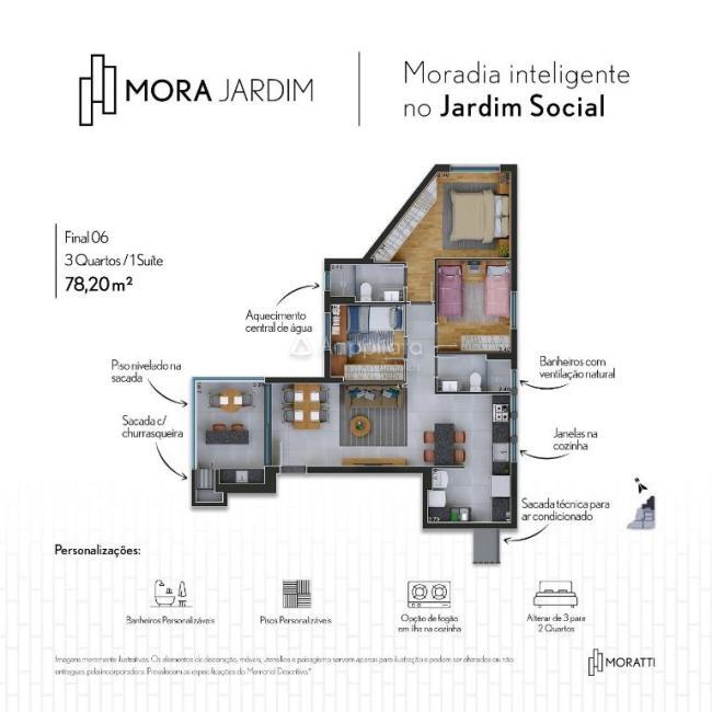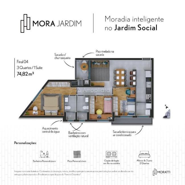 Unidades com 3 quartos contam com suíte, banheiro social, sala integrada com sacada, cozinha, área de serviço e sacada técnica.