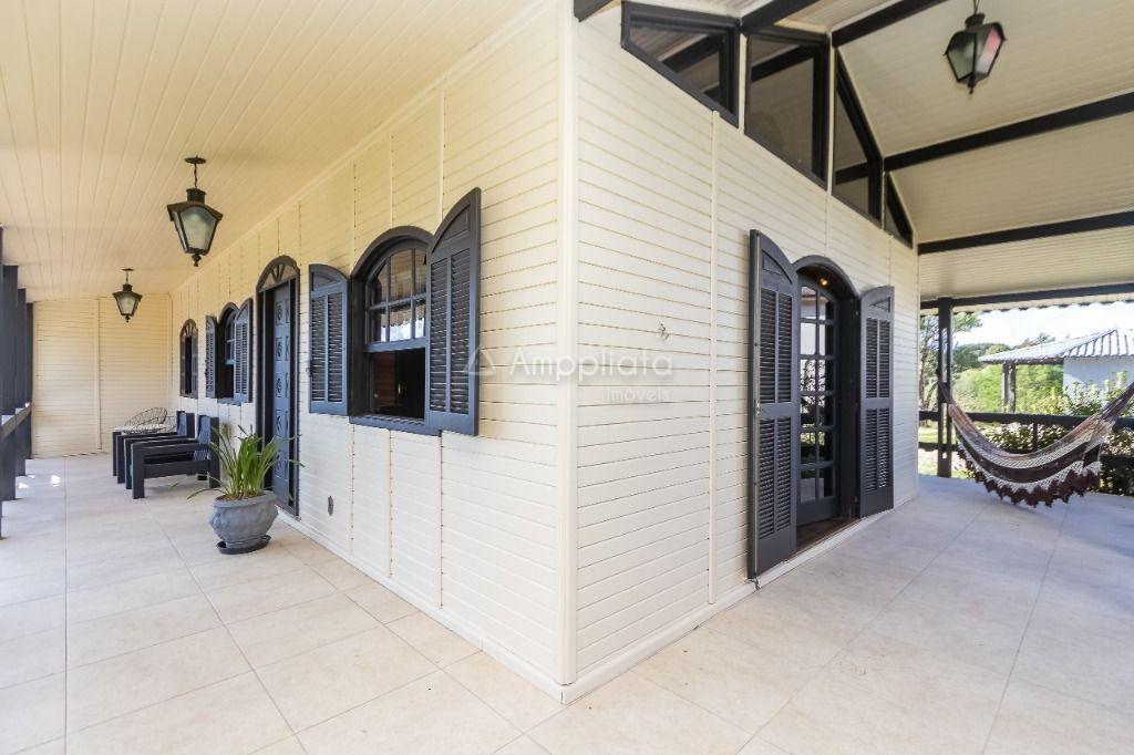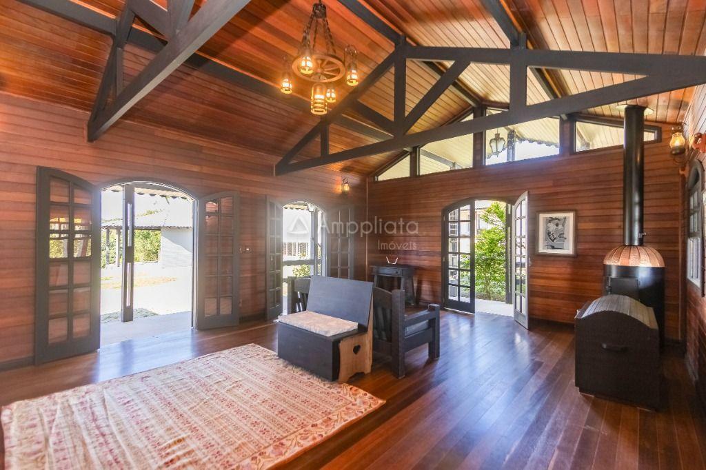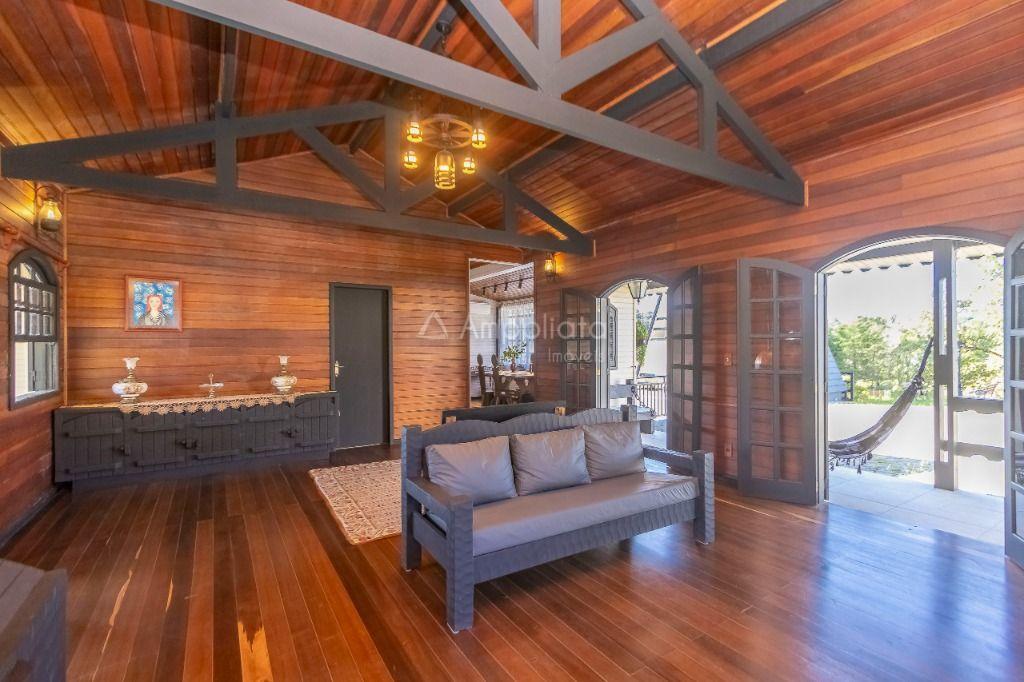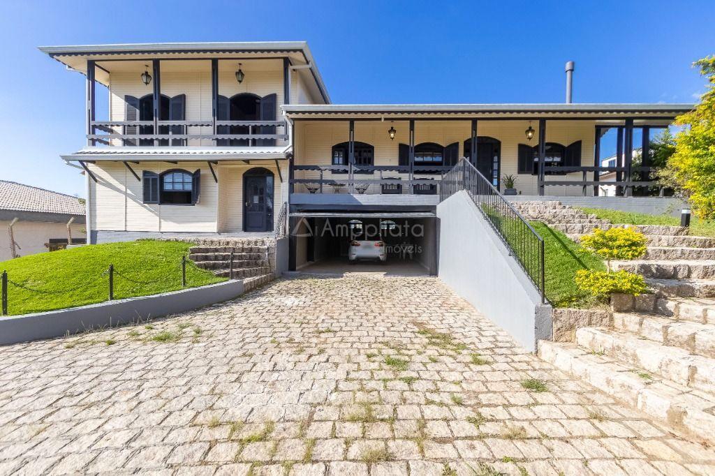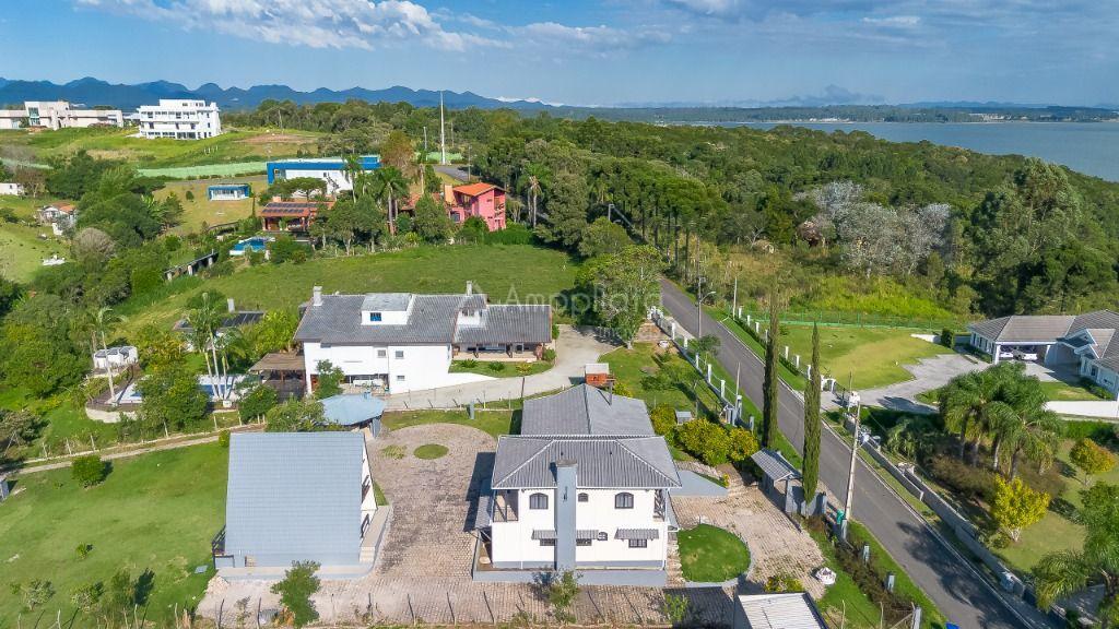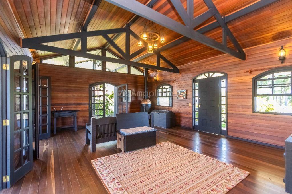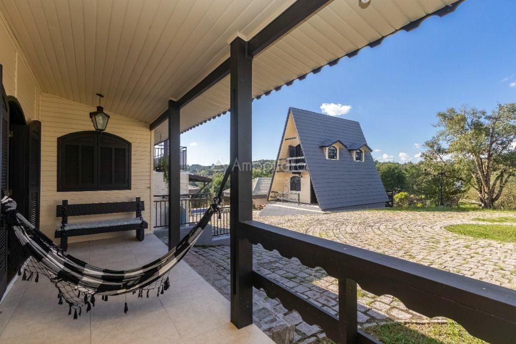 Casa principal: 4 quartos (2 suítes), sala com lareira, salão de festas/jogos, cozinha com despensa, varanda panorâmica, garagem p/ 4 carros.