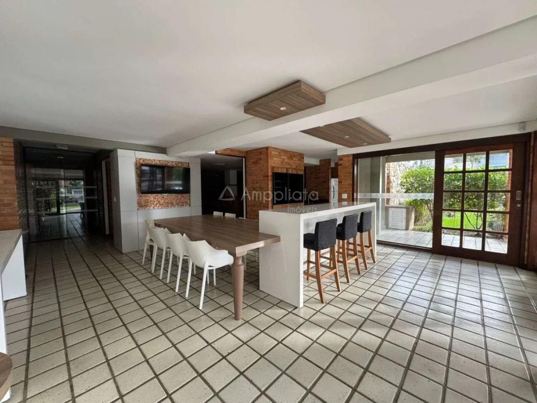 Na área social, a integração entre cozinha, sala de jantar e espaço gourmet com churrasqueira cria um ambiente moderno, funcional e acolhedor. O living amplo, ideal para estar ou home theater, também possui infraestrutura para ar-condicionado.