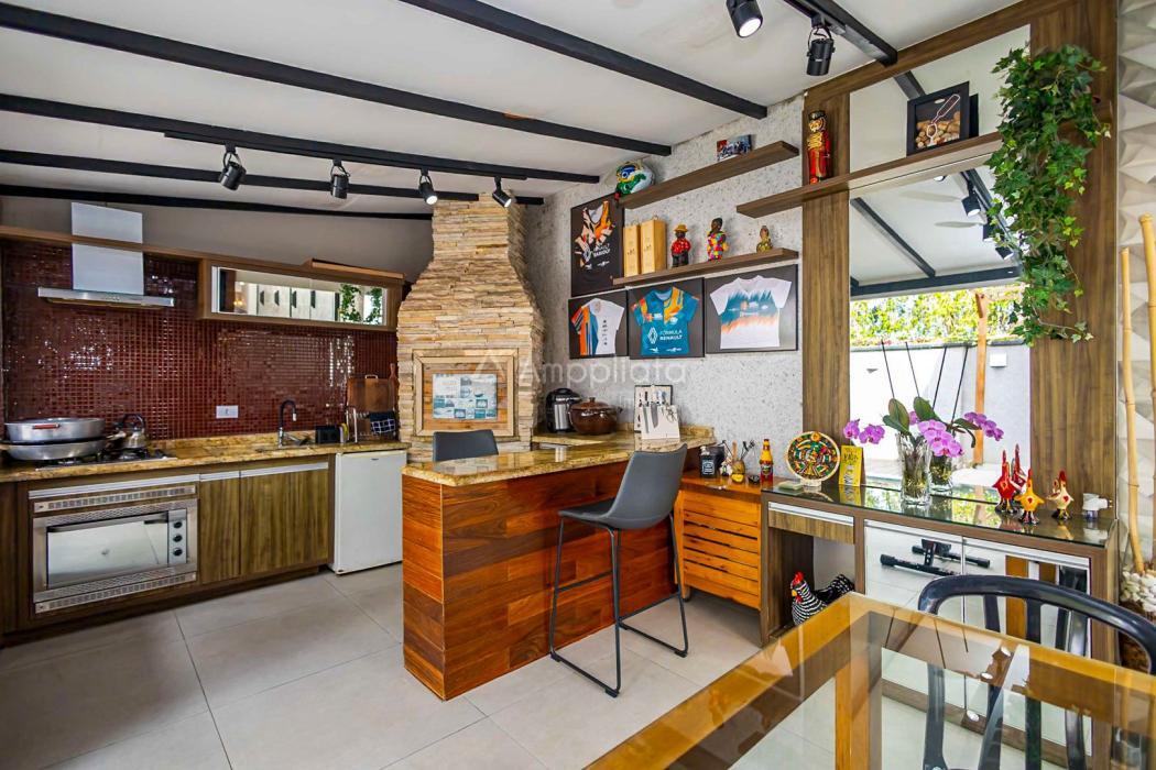 Sala ampla para dois ambientes; lavabo; cozinha; área de serviço; espaço gourmet com churrasqueira carvão; quintal com deck de madeira.